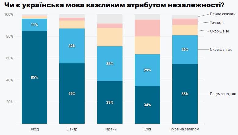 Українська мова є важливим атрибутом незалежності України. У цьому згодні 81% громадян (55% – «безумовно» і ще 26% – «скоріше, так»), причому так вважають в усіх регіонах України: Західному (95%), Центральному (86%), Південному (71%), Східному (64%).