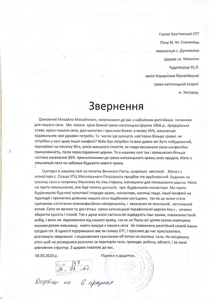 В селі Дунковиці Іршавського району Закарпатської області складається напружена ситуація через незаконне будівництво споруди Московськовського патріархату. Більшість мешканців села є греко-католиками, але монахи з монастиря РПЦвУ з недалекого Сільця намагаються створити осередок московської церкви у Дунковиці.