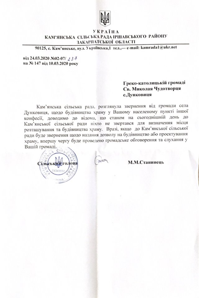 Спочатку мешканці Дунковиці не були категорично проти будівництва, але законним шляхом, а тепер вже категорично проти, законні методи монах хоче обійти, тому ніякого будівництва, а тим більше московської церкви в період війни не дозволять.