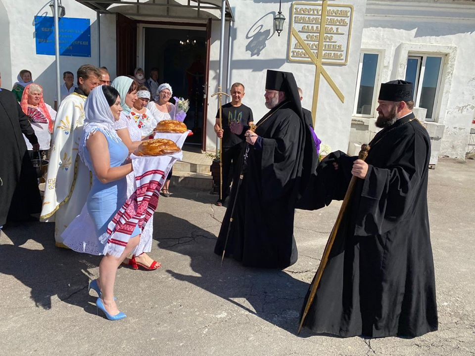 За давніми українськими традиціями перед входом до храму єпископа Харківського і Богодухівського Митрофана та єпископа Луганського і Старобільського Афанасія парафіяни зустріли короваями та квітами, повідомляє пресслужба ПЦУ.
