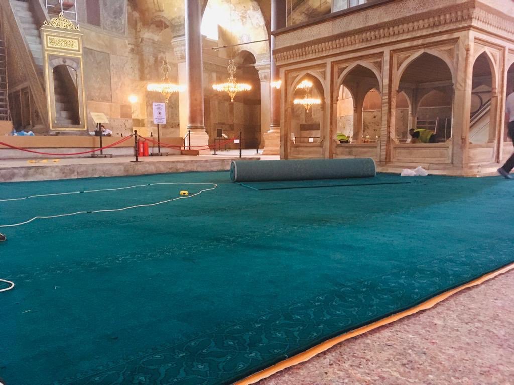 Килими, які будуть використовуватися в святій Софії, виробляються в західній провінції Манісу, в одному з найкращих в країні майстерень. Зроблені на 100% з місцевої вовни, зелені килими зображують османські традиції.