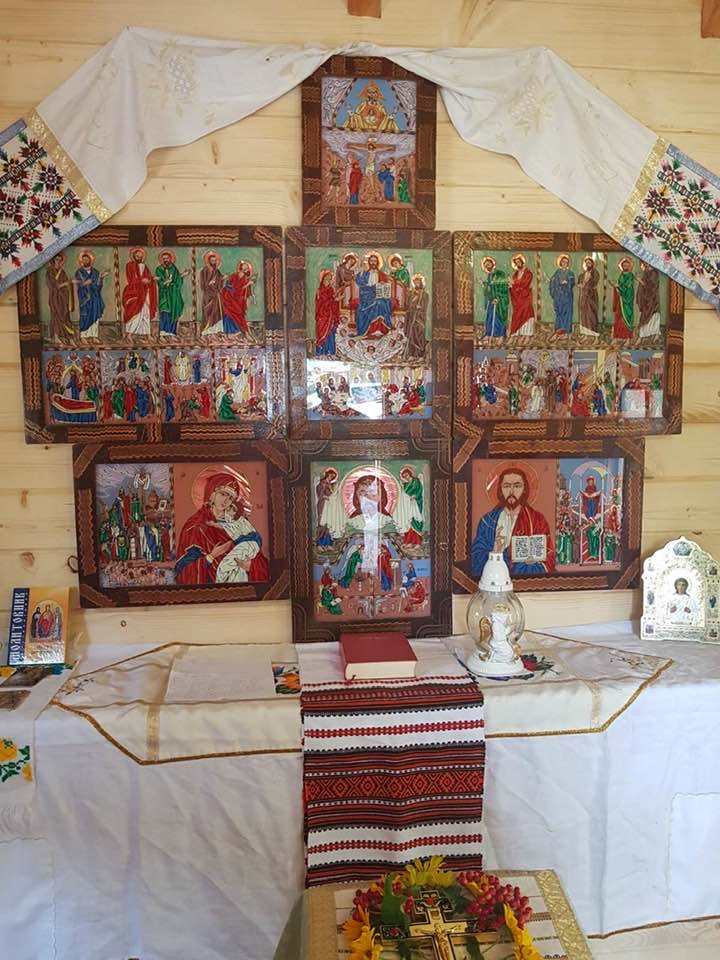 Іконостас виконав у давньому гуцульському стилі розпису ікони на склі і подарував доцент Інституту мистецтв Прикарпатського університету Володимир Лукань.