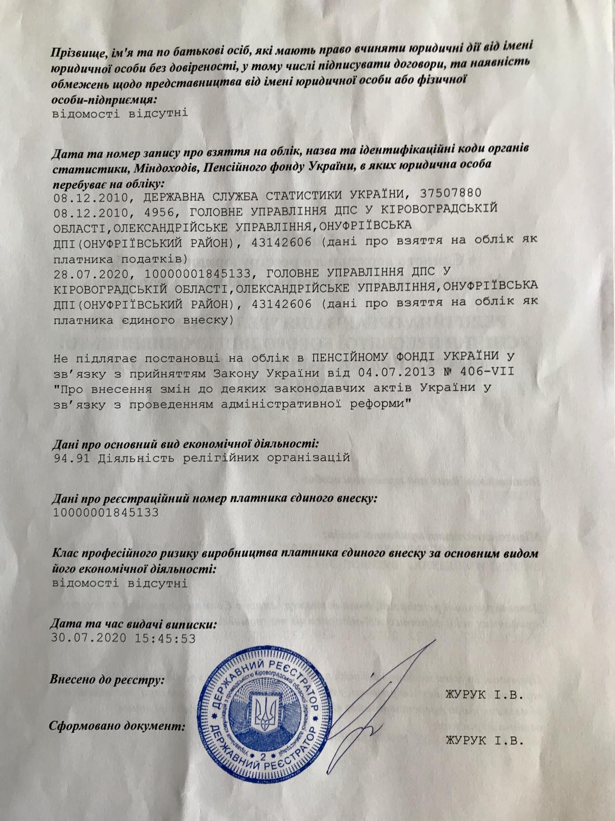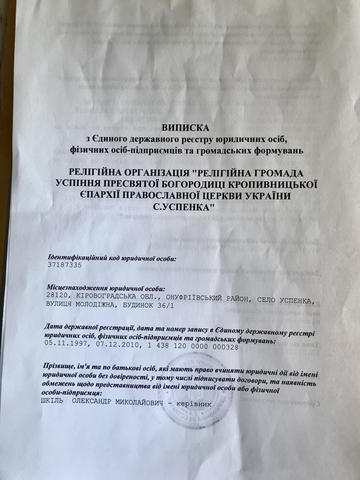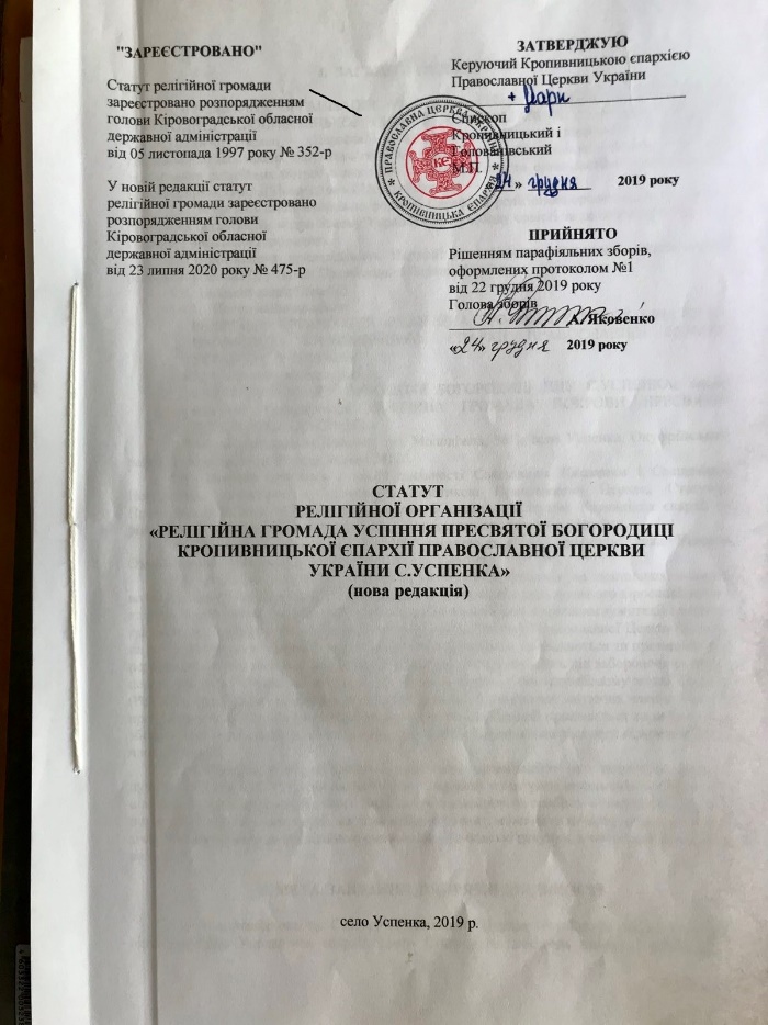 На підставі Протоколу № 1 Парафіяльних зборів від 22 грудня 2019 року та додатків було прийнято нову редакцію статуту Релігійної організації «релігійна громада Успіння Пресвятої Богородиці Кропивницької Єпархії Української Православної церкви України с. Успенка» від 23.12.2019 року.
