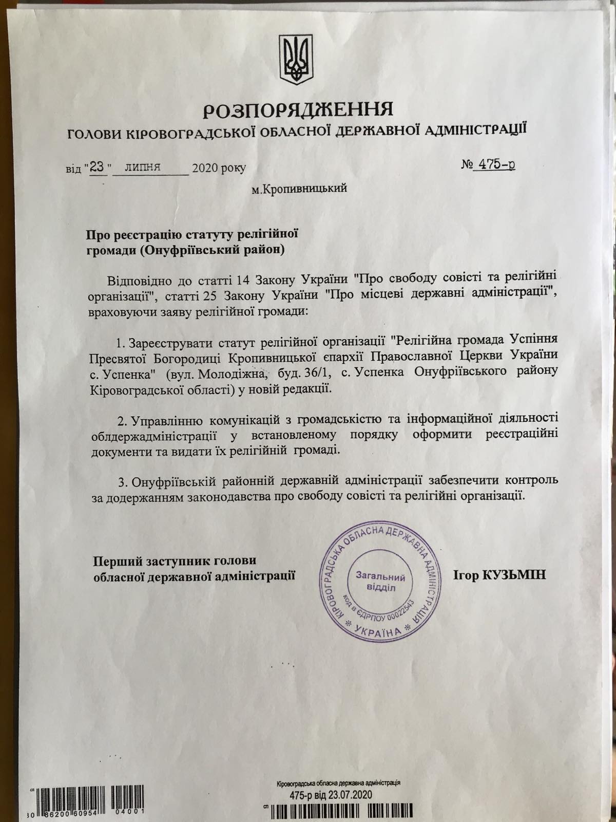 • змінити підлеглість у канонічних та організаційних питаннях Української православної церкви с. Успенки Онуфріївського району та увійти до складу Православної Церкви України, змінивши при цьому назву на: Релігійна організація «Релігійна громада Успіння Пресвятої Богородиці Кропивницької єпархії Православної Церкви України с. Успенка».