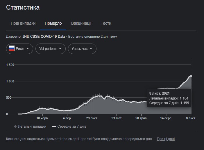8 листопада 2021 року в Росії від коронавірусу померло 1164 людини. Це найвищі показники в РФ серед усього періоду пандемії.