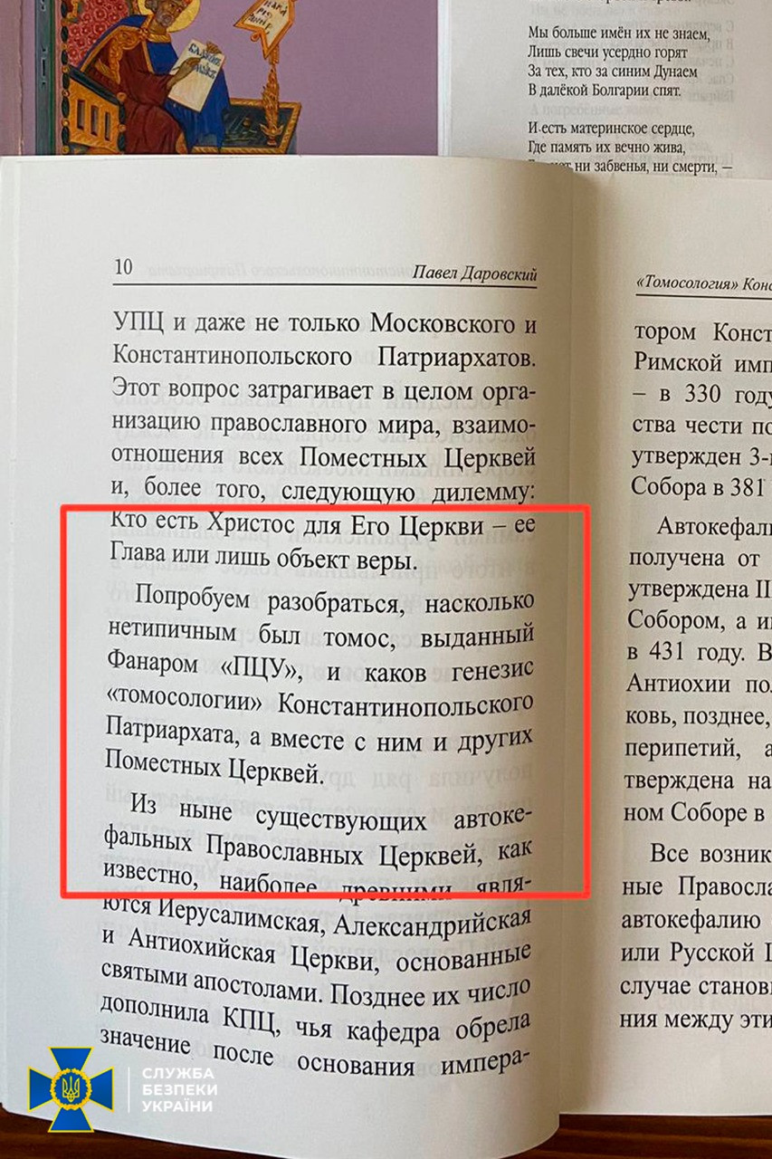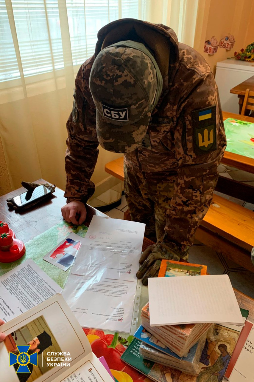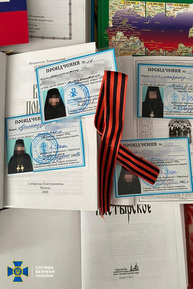 Служба безпеки під час контррозвідувальних (безпекових) заходів на об’єктах УПЦ (в єдності з МП) знайшла російські паспорти, георгіївські стрічки, символіку забороненої партії ОПЗЖ і “методички” Кіріла щодо поширення ворожої пропаганди через вірян.
