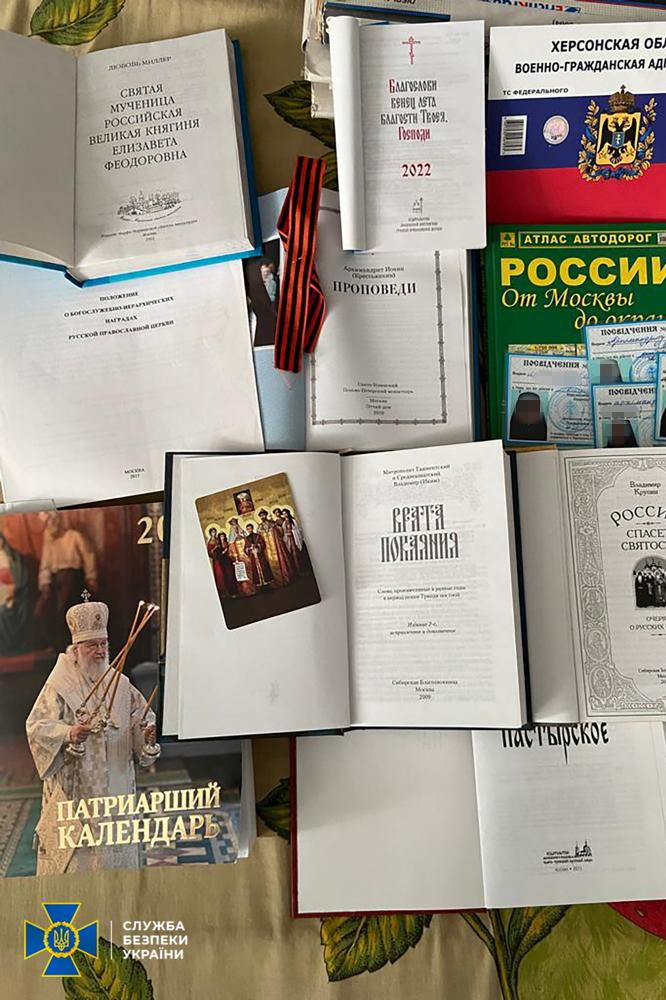 – У цих виданнях представники РФ заперечують існування українського народу, його мови і культури, а також ставлять під сумнів українську державність. Під час огляду церковних приміщень у селищі Чорнобаївка Херсонської області співробітники СБУ виявили бланки перепусток до окупаційних органів РФ, – йдеться у повідомленні СБУ.