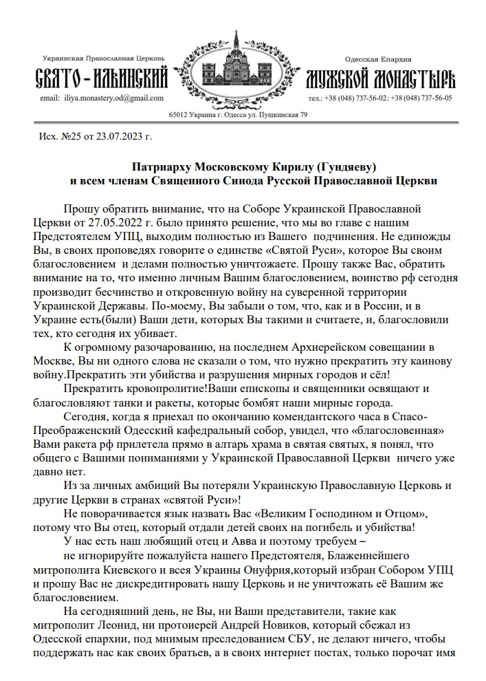 Текст листа опубліковано на Facebook-сторінці Свято-Іллінського чоловічого монастиря.