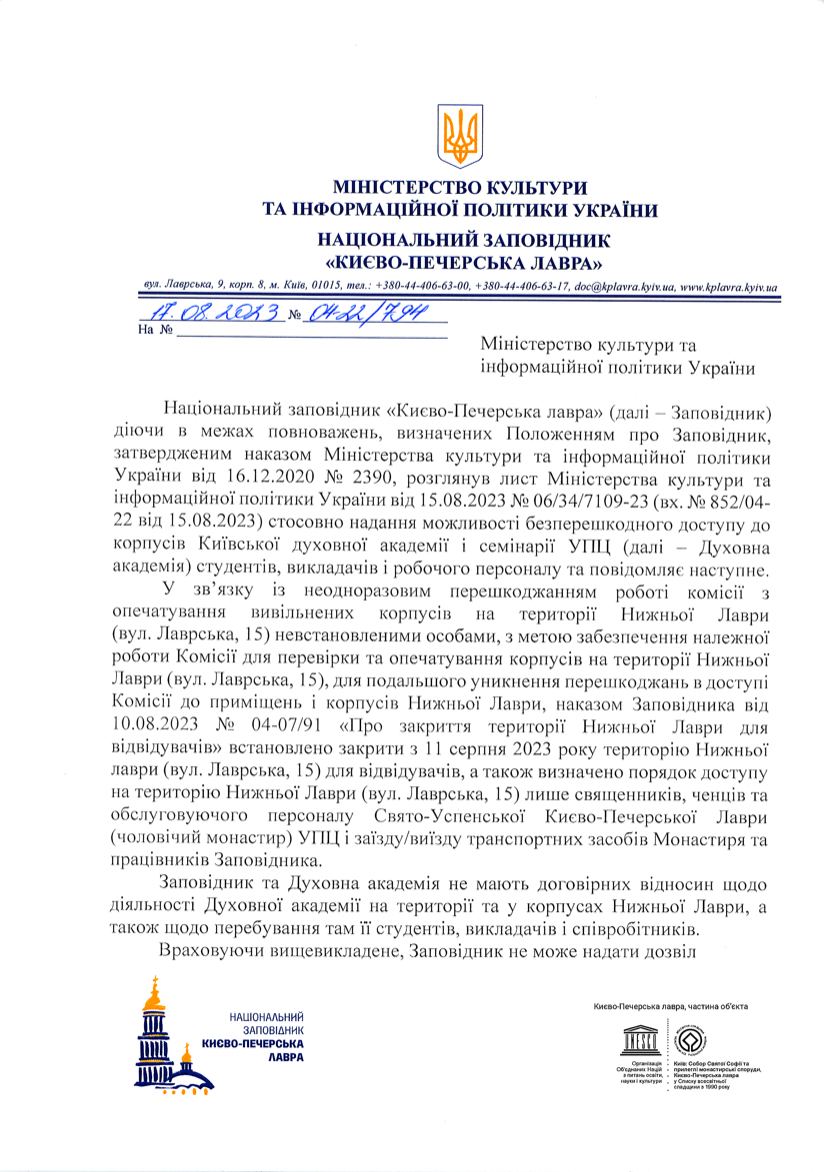 Національний заповідник обмежив доступ студентів та викладачів Київської духовної академії і семінарії УПЦ (МП) на територію Нижньої лаври. Це унеможливлює навчальний процес у приміщеннях духовних шкіл, які використовувались досі. Про таке рішення заповідника повідомляє Інформаційно-просвітницький відділ УПЦ (МП).